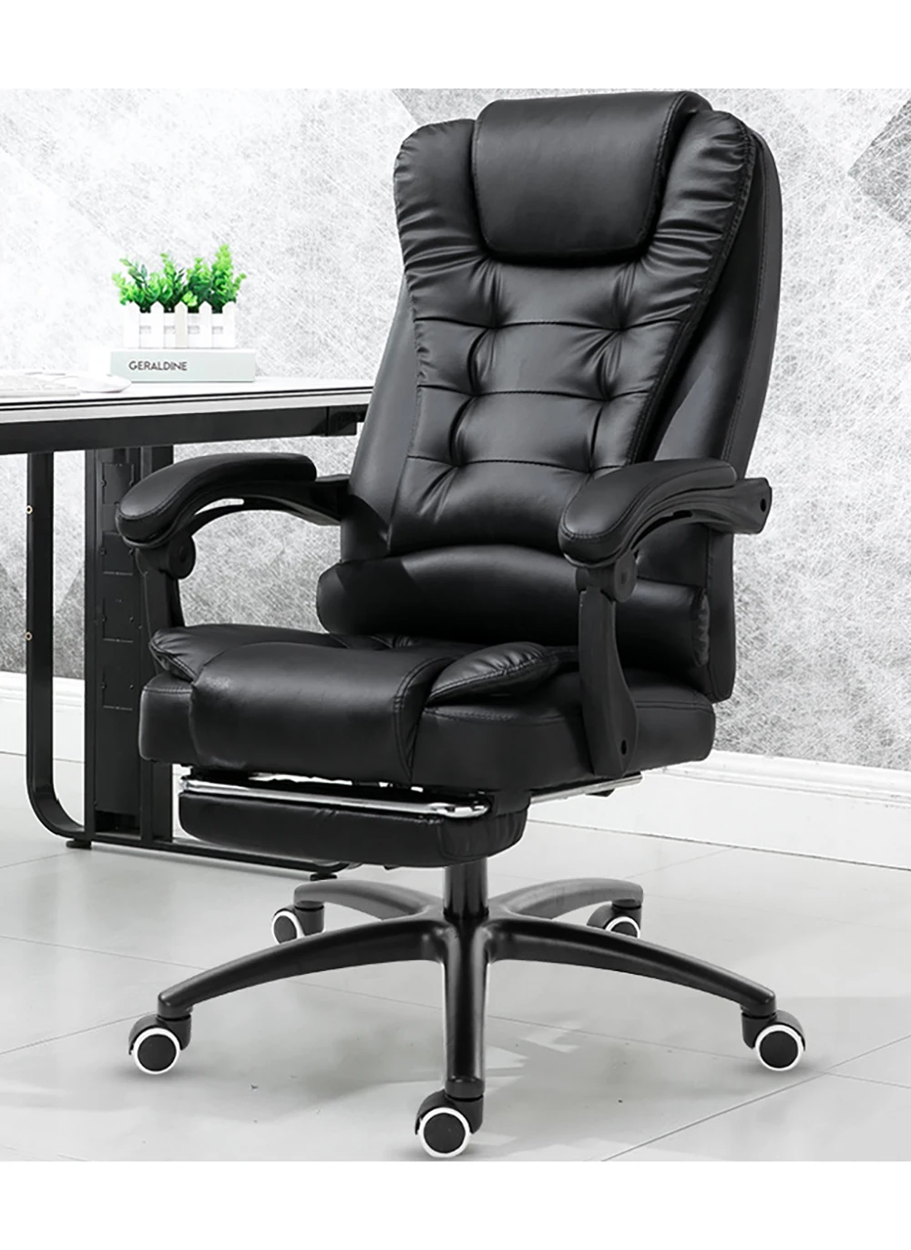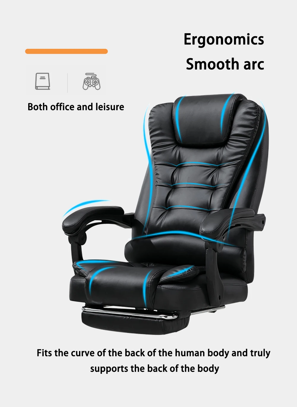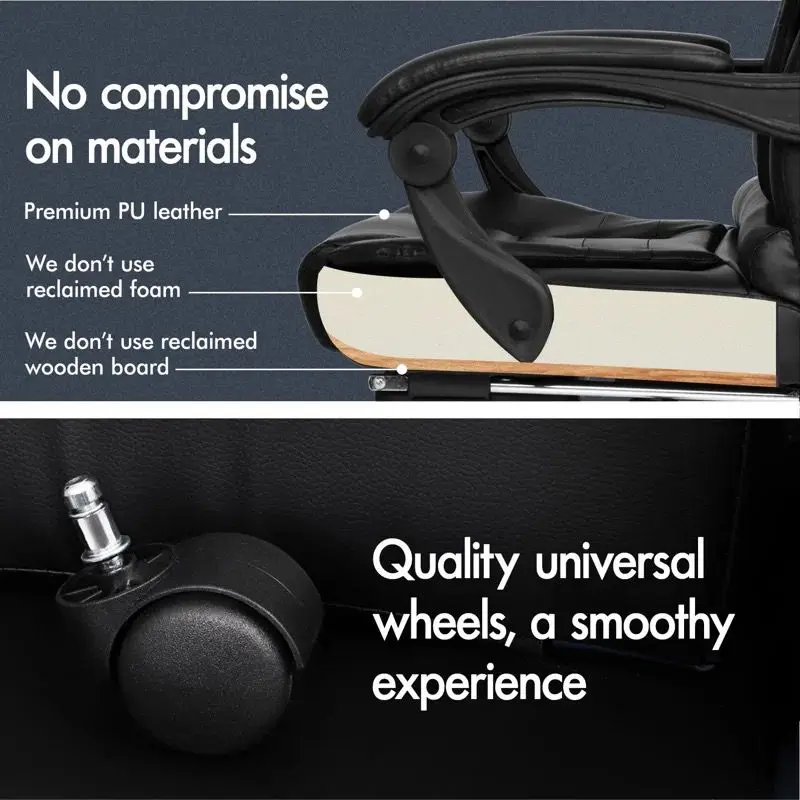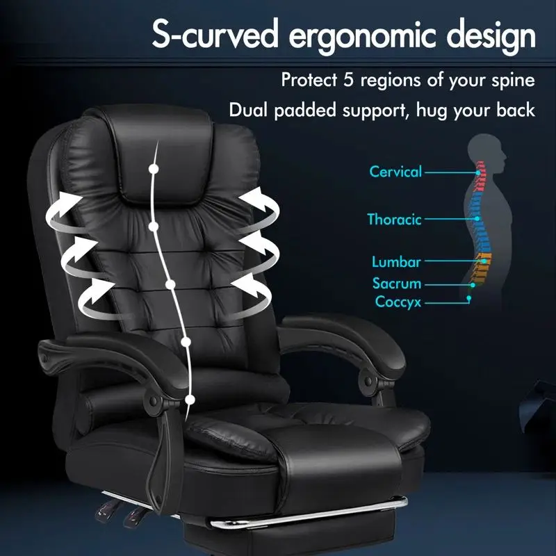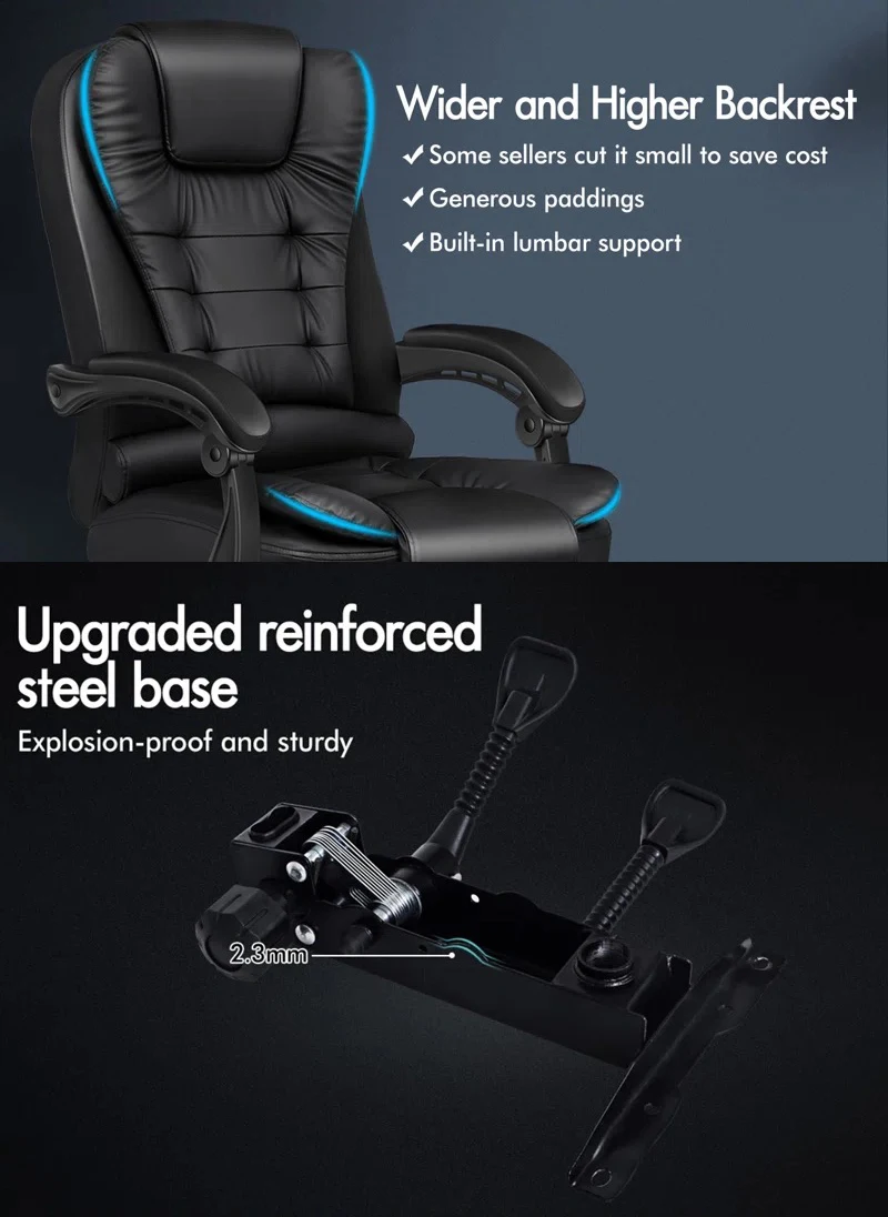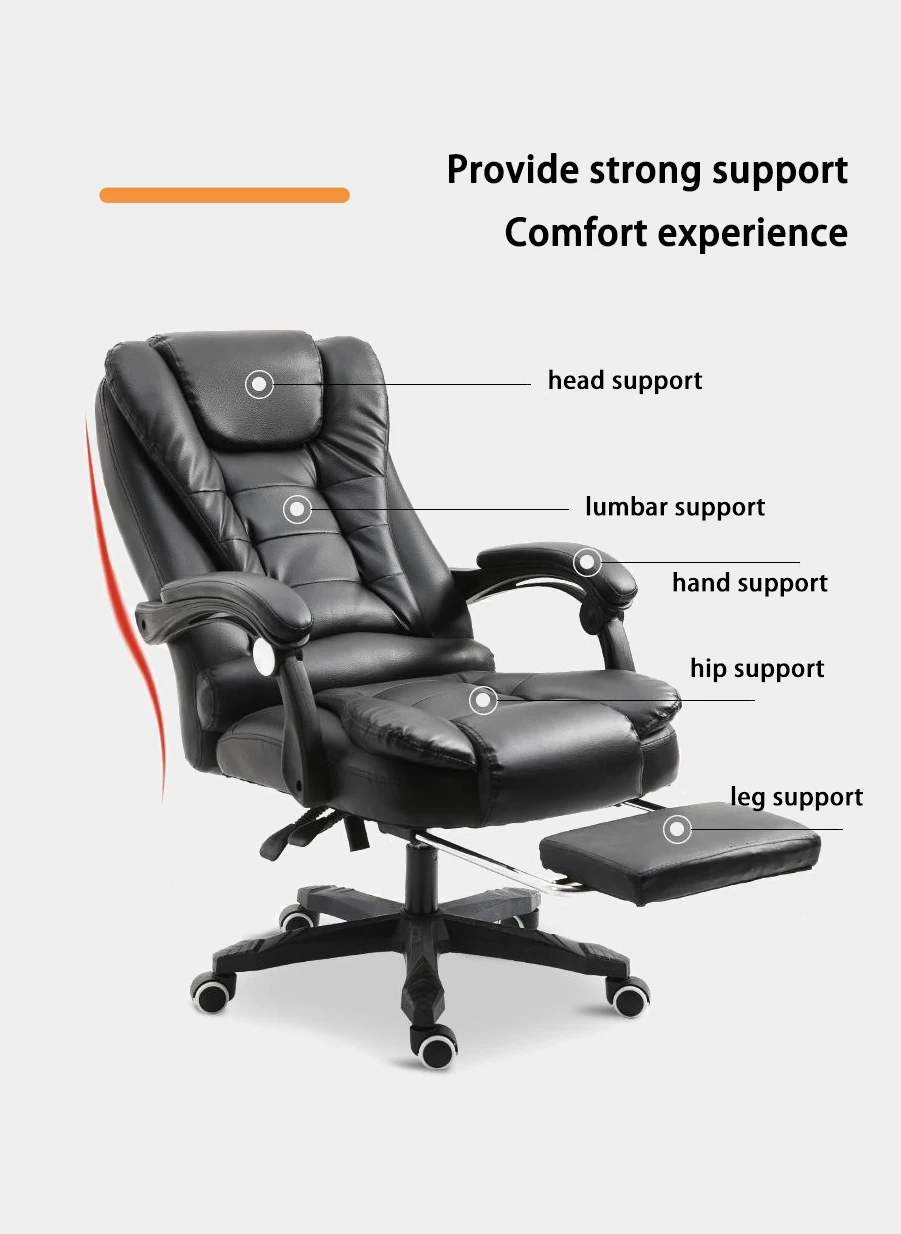 الجزء السفلي من وسادة المقعد مزود بحامل رف دعم القدم ، ويمكن أن يتكئ ظهر الكرسي 135 درجة ، ويمكن سحب الحامل رف دعم القدم لقيلولة مريحة بعد العمل