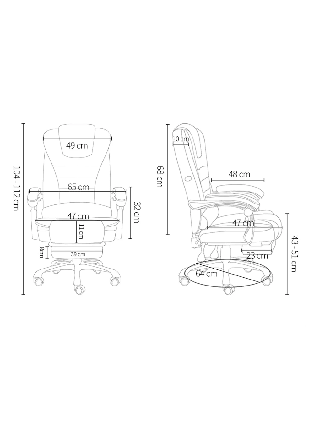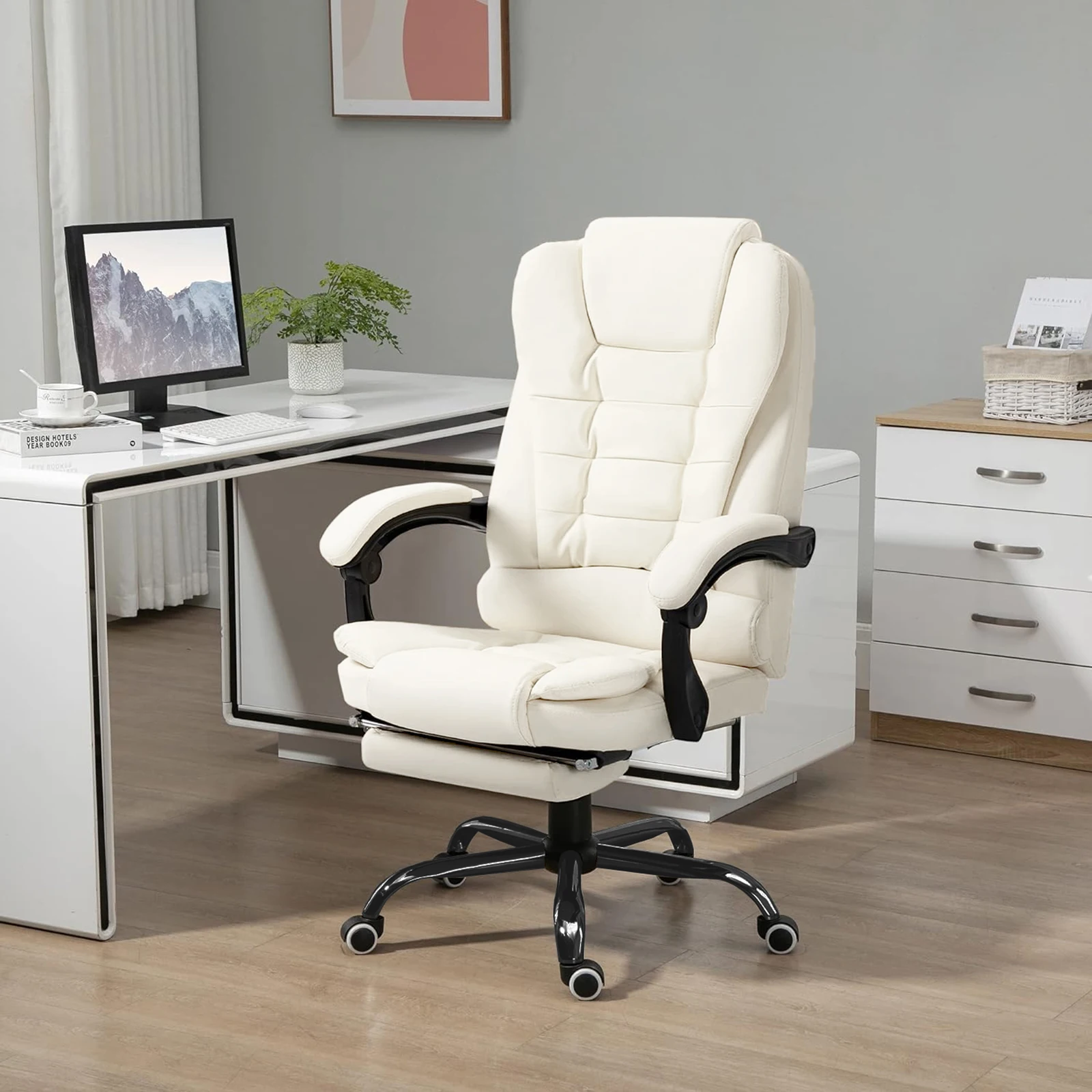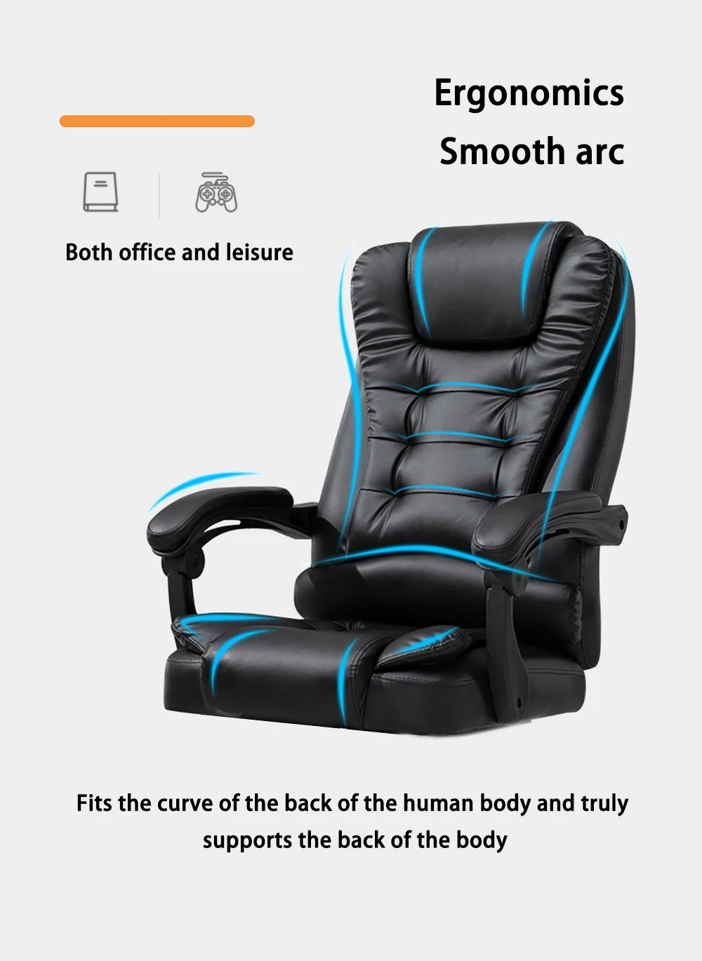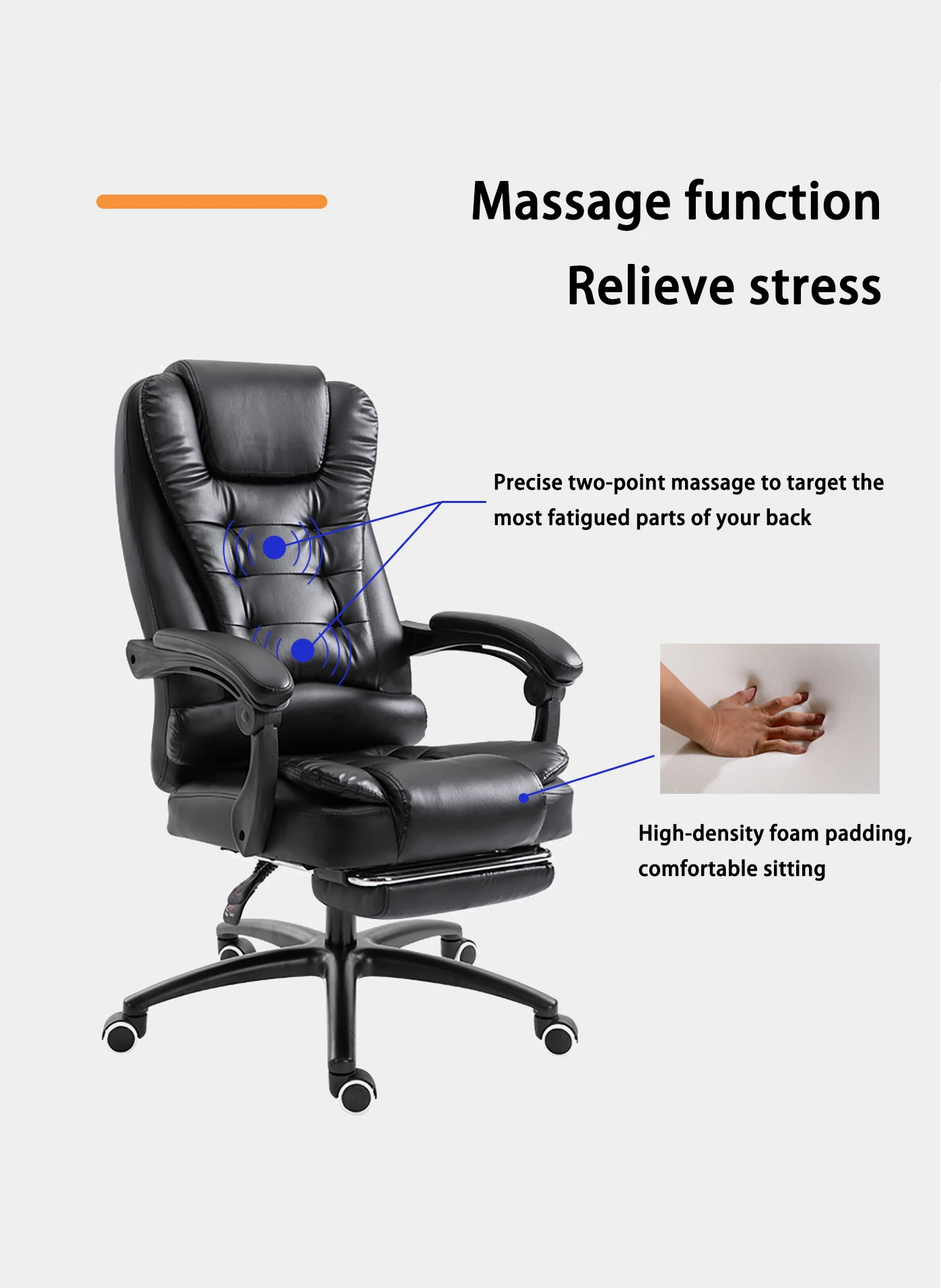 الجزء السفلي من وسادة المقعد مزود بحامل رف دعم القدم ، ويمكن أن يتكئ ظهر الكرسي 135 درجة ، ويمكن سحب الحامل رف دعم القدم لقيلولة مريحة بعد العمل