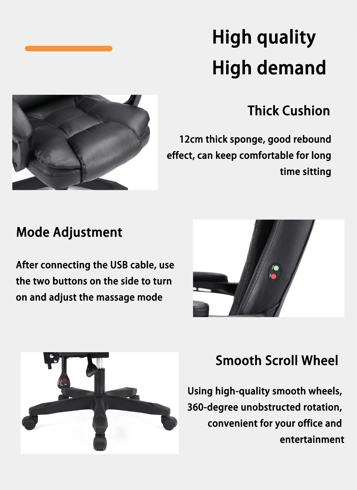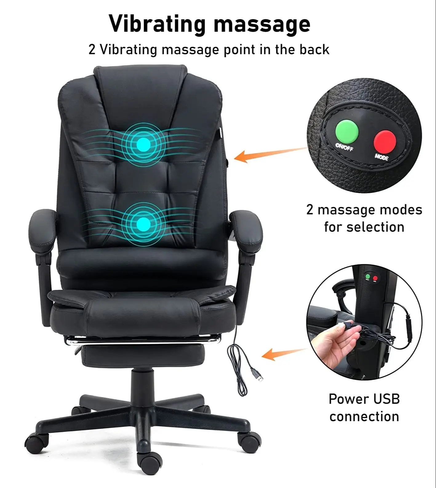 يحتوي هذا الكرسي على وظيفة تدليك من نقطتين ، قم بتوصيل منفذ USB على جانب الكرسي للاستمتاع بالتدليك وتخفيف التعب